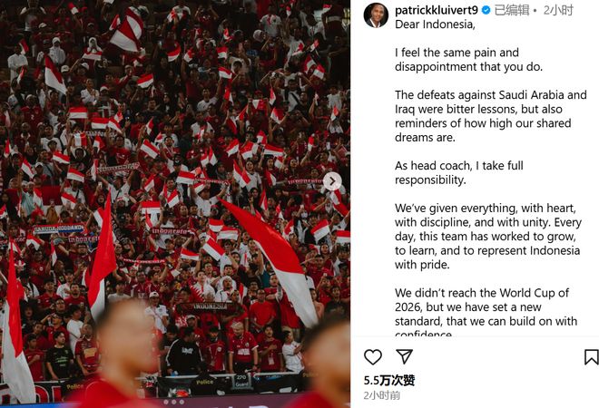 镭速体育10月13日电 印尼国家队主帅克鲁伊维特在社交媒体上发文,为球队未能获得2026年世界杯参赛资格表示歉意。印度尼西亚在2026年世界杯预选赛第四阶段输给了沙特阿拉伯和伊拉克,以微弱优势无缘世界杯。克鲁伊维特先生致印度尼西亚人民的道歉信:我和你们有同样的感受,我感到受伤和失望。沙特阿拉伯和伊拉克的损失是惨痛的教训,但它们也不断提醒我们,我们所有人的梦想是多么崇高。作为国家队主帅,我将承担全部责任。我们以热情、严格的纪律和团结的精神奉献了我们所拥有的一切。这支团队每天都在努力成长并积累经验,并始终自豪地代表印度尼西亚。尽管我们没有获得2026年世界杯的参赛资格,但我们为印尼足球树立了新的标杆,我们可以充满信心地继续在此基础上继续前进。我们工作过轮胎更不用说将国内和国际球员团结成一个紧密的家庭。我的技术团队始终团结一致,为团队提供了坚实的支持。对于这支球队、这个国家以及所有相信印尼足球的人来说,这只是漫长旅程中的一个目的地。真正的进步需要时间的积累,我们共同创造的一切不会在今天停止,并将继续成长和发展。种子已经种下。它根深蒂固在我们的心态中,根深蒂固在我们的足球文化中,并传达了“印度尼西亚值得登上世界足球最高舞台”的信念。感谢我们所有的关注者。无论是在看台上、在街上还是在主屏幕前,您将始终为我们提供帮助。您的声音很重要,您的支持给我们力量,您的信任让我们前进。谢谢你!