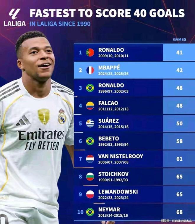 单击本文右上角的“关注”按钮支持我们。 10月8日,当足坛还在关注姆巴佩融入皇马以及他的表现时,德国转会市场(German Transfer)的可靠统计数据创下了这位法国巨星在西甲首个赛季的纪录。据统计,姆巴佩在仅仅42场比赛中就打进了40个联赛进球。这一效率是1990年以来西甲历史第二高,仅次于传奇前锋C罗的41场比赛,甚至比“外星人”C罗还要好。这不是一个冰冷的数字,而是一个新王者在伯纳乌星光下崛起的宣言。上周末皇马3-1战胜比利亚雷亚尔的比赛中,姆巴佩的进球不仅锁定了球队的胜利,也标志着他个人西甲生涯的里程碑。这个进球是本赛季联赛第 40 号球衣。当他到来时,人们对他寄予厚望,但现在,进球进球后,他扫清了一切疑虑,姆巴佩以最直接、最纯粹的方式不辜负了这座伟大球场、无数传奇人物的故乡的期望。要了解这一壮举的黄金内容,有必要将其置于联盟悠久而辉煌的历史中。自1990年以来,这座球场见证了无数顶级射手的诞生。从“独狼”罗马里奥到“指环王”劳尔,从“猎豹”埃托奥到“葫芦娃”比利亚,穿越梅西、C罗时代,所有在西甲留下印记的前锋都是足坛历史上的传奇人物。姆巴佩在 42 场比赛中打进了惊人的 40 个进球,在这份众星云集的榜单上名列前茅。在他面前的是克里斯蒂亚诺·罗纳尔多,一位超级偶像,在皇马的九年里,他把进球变成了一种艺术,把胜利变成了一种习惯。 C罗在41场比赛中打进40球,体现了他巅峰时期无与伦比的统治力。姆巴佩已经非常接近这个奇迹了就效率而言,他甚至超越了巅峰时期的C罗(48场40球),这本身就说明了他有多么的非凡。正如罗纳尔多以无与伦比的速度、爆发力和技巧征服世界一样,姆巴佩也用同样的方法,将现代足球的更快节奏与更严密的防守结合起来,展现了他作为新时代前锋的优越性。这个列表中包含的不仅仅是速度。这背后是持续高效的生产。在42场比赛中保持场均接近1球的进球率,不仅需要球员拥有一流的射门技术和爆发力,还需要具备出色的应对对手紧张赛程、进攻和针对性防守的综合能力。姆巴佩在皇马的角色已经从边锋的角色演变而来,最初的边锋必须适应终结者,现在已经变得非常舒服。他的进球方式多种多样,包括闪电般的反击、禁区内冷静的射门、甚至是狂暴的中距离射击。这种多才多艺使他成为任何防守的噩梦。同样值得反思的是,姆巴佩的成就诞生于梅西、C罗之后的时代。随着西甲“双雄”落下帷幕,人们好奇谁会是下一个扛起联盟曾经进攻性旗帜的人。姆巴佩的到来以及他的快速融入和爆发无疑给了我们这个问题一个很好的答案。他希望用自己的表现填补两位传奇人物留下的空白,开启属于自己的“姆巴佩时代”。